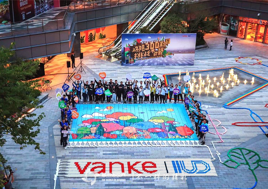 最后,隊(duì)員們組成人浪,圍在多米諾骨牌作品四周,形成了一道特殊的風(fēng)景,既減弱了秋風(fēng)的威力,又為多米諾骨牌表演增添了新意。表演開始,現(xiàn)場音樂聲響起,人浪高低起伏繞場前行一周后,最后一位隊(duì)員啟動(dòng)了骨牌,一幅幅多米諾圖案成功呈現(xiàn)。骨牌在場地內(nèi)穿梭前行,引動(dòng)噴泉噴薄而出。當(dāng)上萬產(chǎn)城LOGO和巨幅熱帶雨林畫面呈現(xiàn)在大家面前,歡呼聲、喝彩聲響徹全場。
