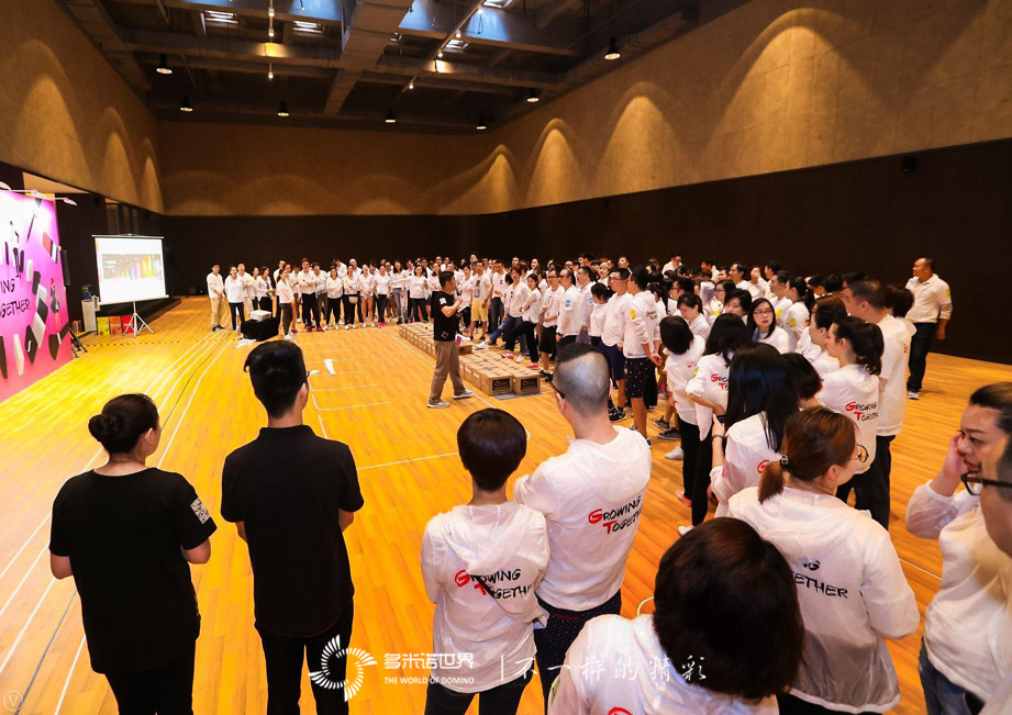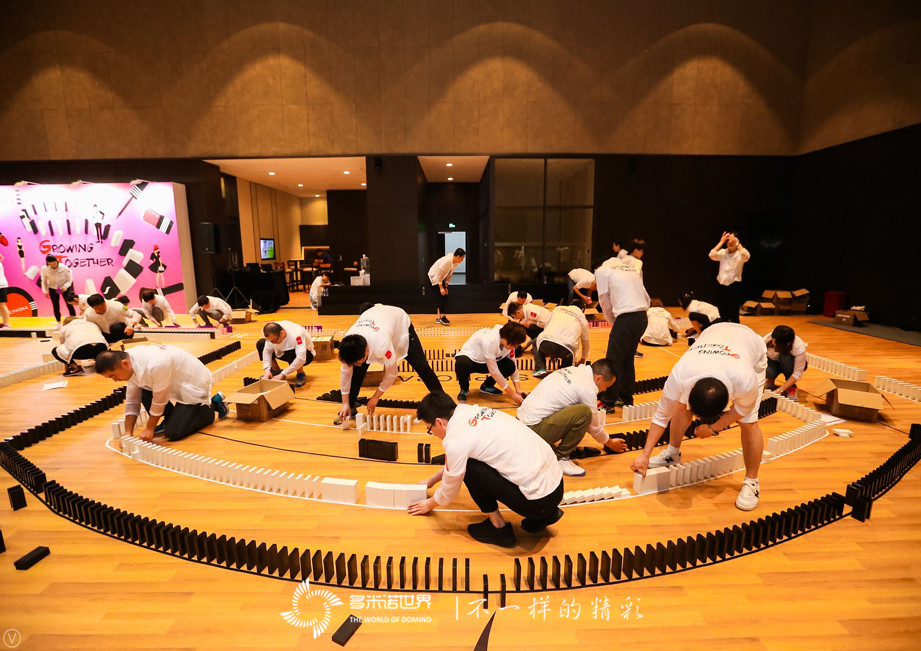啟動(dòng)的金球順勢(shì)而下,撞擊到第一枚多米諾骨牌,一幅幅多米諾畫(huà)面成功呈現(xiàn),隨著骨牌的前行,隊(duì)員們都紛紛高舉手機(jī),記錄這精彩難忘的一刻,當(dāng)場(chǎng)地中央的巨幅畫(huà)面成功展現(xiàn),“Growing Together”映入大家眼簾,至此,一幅精美的絲芙蘭多米諾畫(huà)卷完全顯露出來(lái)。